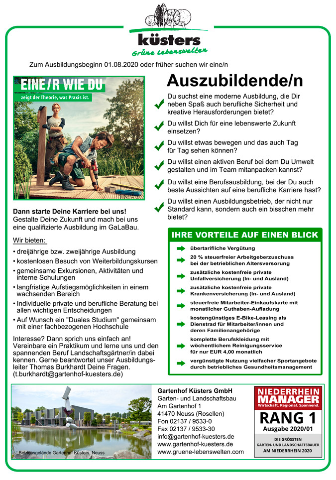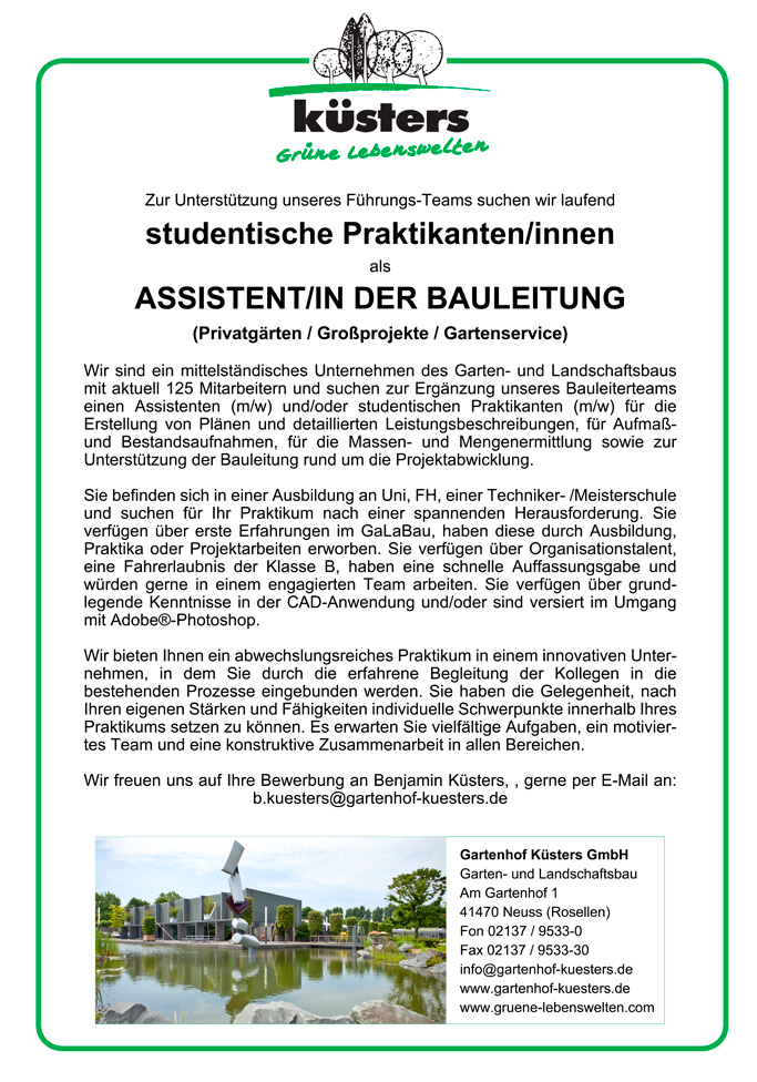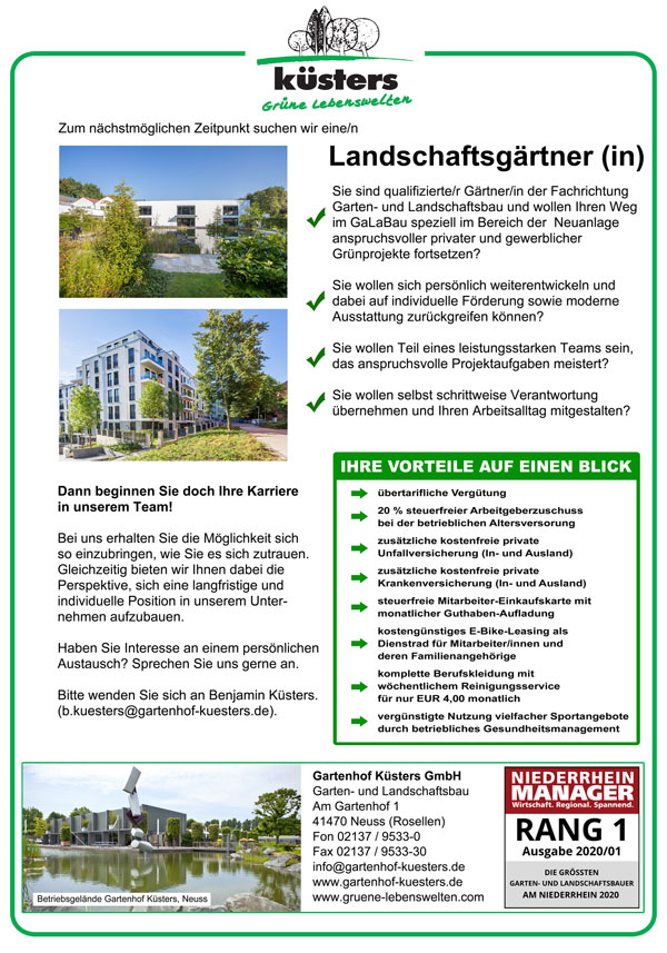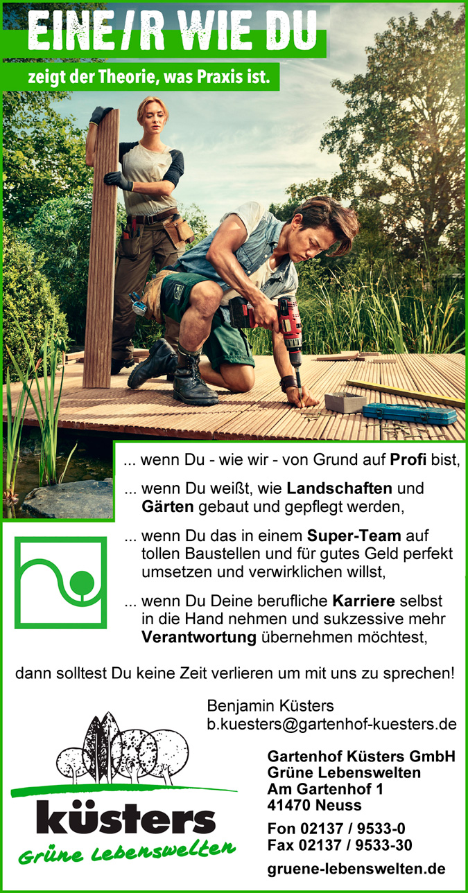 Sie suchen ein großes, innovatives GaLaBau-Unternehmen mit umfassendem Leistungsprofil, einzigartigen Projekten und ca. 120 Mitarbeitern, die sich in einer lebendigen Zusammenarbeit in starken Teams ergänzen und mit technischem Know-how, Engagement und viel Freude grüne Lebensräume schaffen.